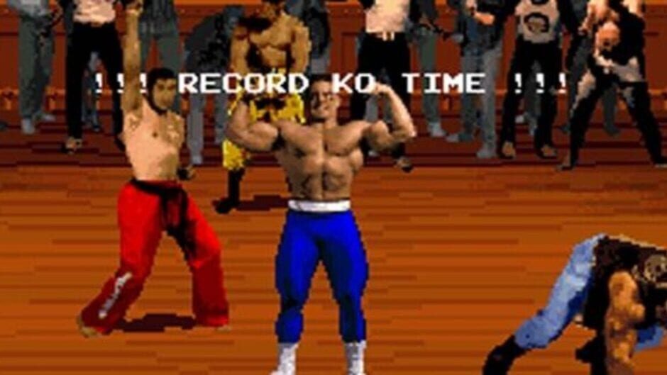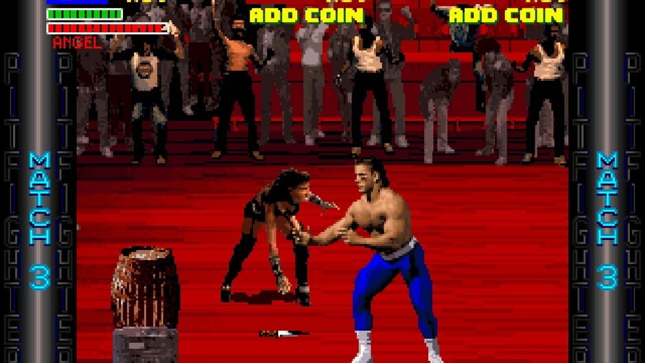 The gameplay is similar to Taito's Violence Fight and SNK's Street Smart. The player must jump, punch, and kick their opponent until his/her energy runs out. If the player presses all three of the buttons at a time, the character will perform a "super move". The player begins Pit-Fighter by choosing one of the three playable characters, who all have different moves, speed, and power. In the player select screen in the arcade version, each player has a color to select the fighters with: for player one it's blue, for player two it's red and for player three it's yellow. As many as three people can play at a time, but there will be extra opponents to fight during any of this game's 15 different matches. Every third fight is a bonus round known as a Grudge Match.[1] In a Grudge Match, the player must fight against a CPU controlled clone of his or her fighter (if playing alone) or the other players in a multiplayer game. Getting knocked down three times eliminates a player from the Grudge Match, the winner is the last man standing. Losing the Grudge Match does not eliminate a player, but the winner gets bonus money. The final battle, the "Championship Match", is between the player and the mysterious entity that taunts between matches every once in a while, the Masked Warrior. If more than one person is playing the game before this match, they must fight each other to the death until only one becomes victorious and can fight him. Sometimes during matches the player will come across foreign objects such as knives, crates, sticks, motorcycles, and bar stools that can be thrown at you or your opponent. The player may also come across a power-up known as the "power pill". If the player or the opponent grab this item, one will become temporarily stronger and take less damage from hits. At times even the crowd will interfere in the fights. Two characters, known as Knife Man (Milt Loper) and Knife Woman (Dianne Bertucci), will come out of the crowd and stab the player with their daggers. The player can take these nuisances out with one hit. Sometimes there is also a fat bearded man with a stick. If the player knocks him down, the player can take the stick and use it against the current opponent. The audience will also push any fighter that ends up among them, and stays there more than a few seconds. They will be forced back into the fighting area.