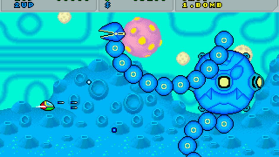 Fantasy Zone is an arcade style shooter for one or two players. The goal is to destroy all of the creatures on each planet and collect as many of the lost coins as possible. At the end of each level is a large enemy that will have to be defeated before moving on to the next world. At various points in the game, the player will be able to find a parts shop, which allows purchasing improvements for his spaceship, including better weapons and faster engines.