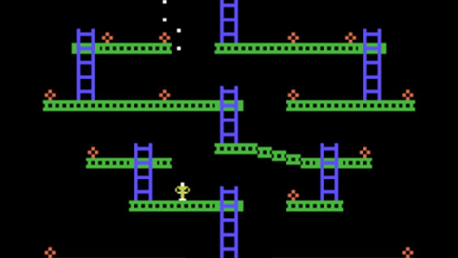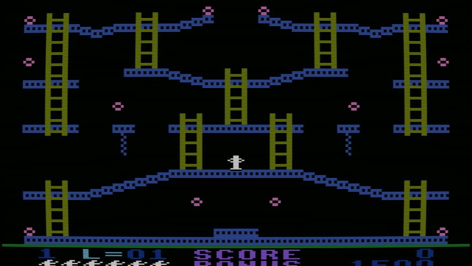 Jumpman Junior is the sequel to Jumpman and features similar gameplay with all new levels. As Jumpman, your goal is to disarm all of the bombs on the level before time runs out. Each level consists of a variety of platforms, ladders, and ropes you will need to jump and climb to reach the bombs. To make the game more challenging, a bullet will fire on the screen from time to time which will cause Jumpman to lose a life if hit. Each level has a different theme to it, and a few also have additional dangers as well. You will encounter deadly fires, the bouncing hellstones, moving ladders, disappearing platforms, and more.